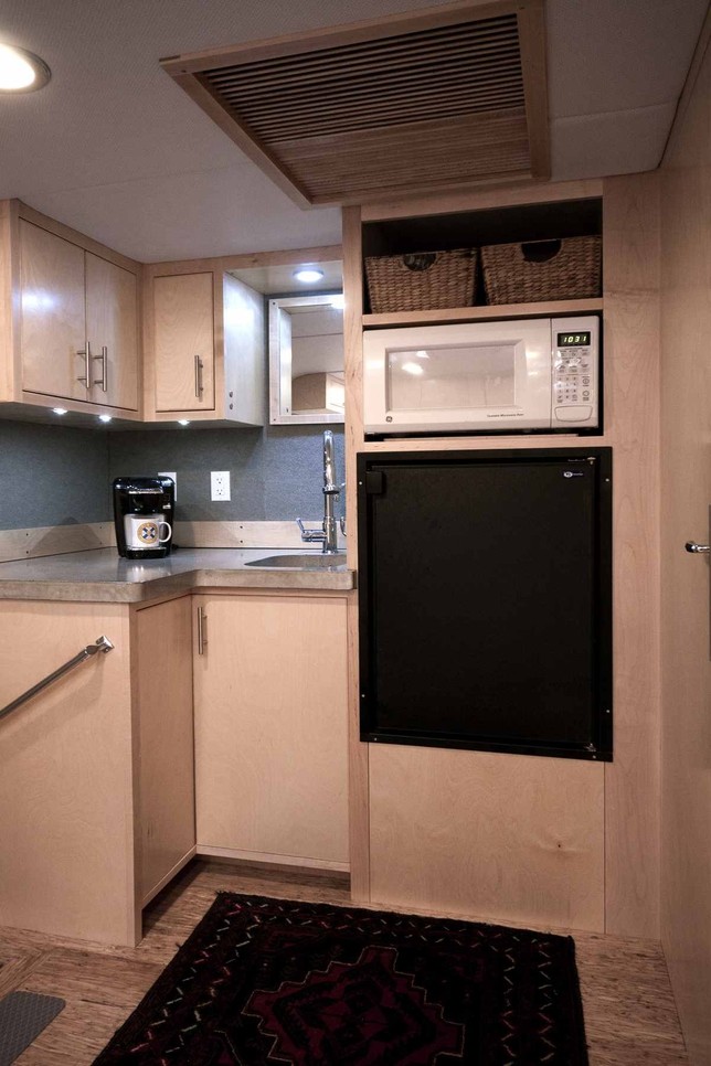 He started with a heavy duty Hallmark cargo trailer (16 ft.) which transforms from living, dining to bedroom within minutes. Some serious features are: 2 skylights, birchwood walls, compressed mulberry bushes for floors (Don’t even know how you would come about that?!), sink granite countertop, 26 inch flatscreen TV (connectivity to Apple TV and DirecTV), and wifi capability.
